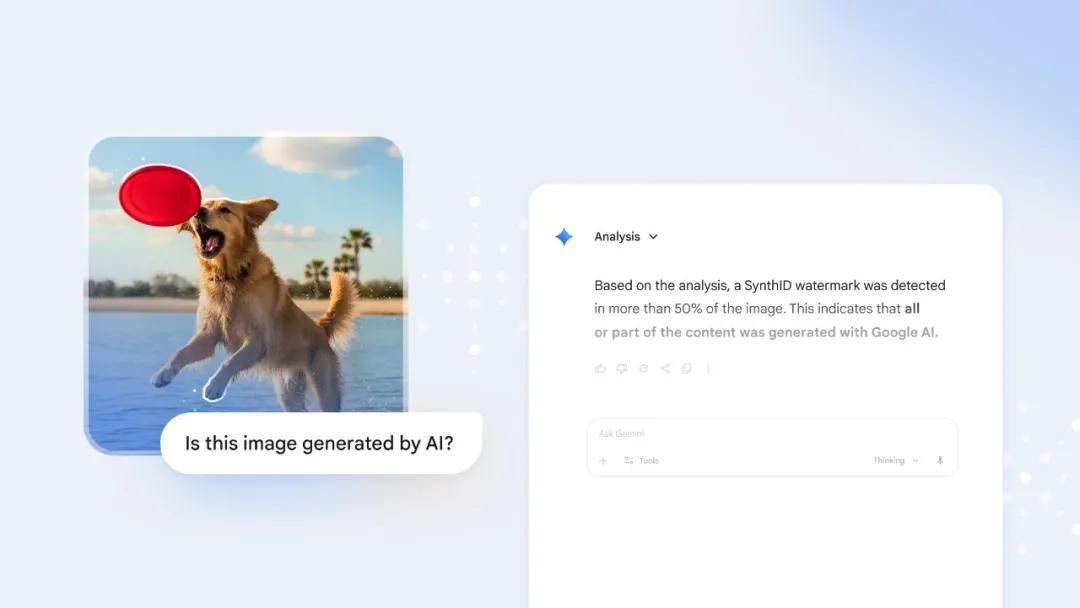 Gemini 会检测图像中的 SynthID 水印,并结合自身的推理能力,为用户提供结果,使用户更了解你在网上看到的内容的背景。不久后,谷歌将扩展 SynthID 验证能力,支持包括音视频在内的更多格式,并让这些能力覆盖更多产品,如搜索等。
