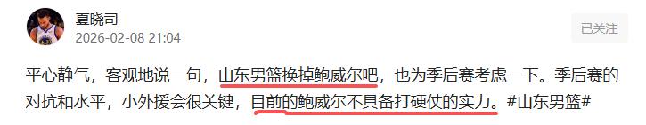 可以说鲍威尔比国内球员的表现还要差,打完半场一分不得,下半场邱彪只让他打了3分多钟,运动战一分不得,靠罚球捡到了2分。全场打了9分17秒,6投0中,运动战得0分,这样的外援相当不存在,签他也是多余的。由于个子矮,对抗差,防守端问题也大,成为对手的突破口。看到鲍威尔的表现,山东球迷和媒体人也是非常生气。山东媒体人夏晓司直接了当的表示,必须换掉鲍威尔,“平心静气,客观地说一句,山东男篮换掉鲍威尔吧,也为季后赛考虑一下。季后赛的对抗和水平,小外援会很关键,目前的鲍威尔不具备打硬仗的实力”。