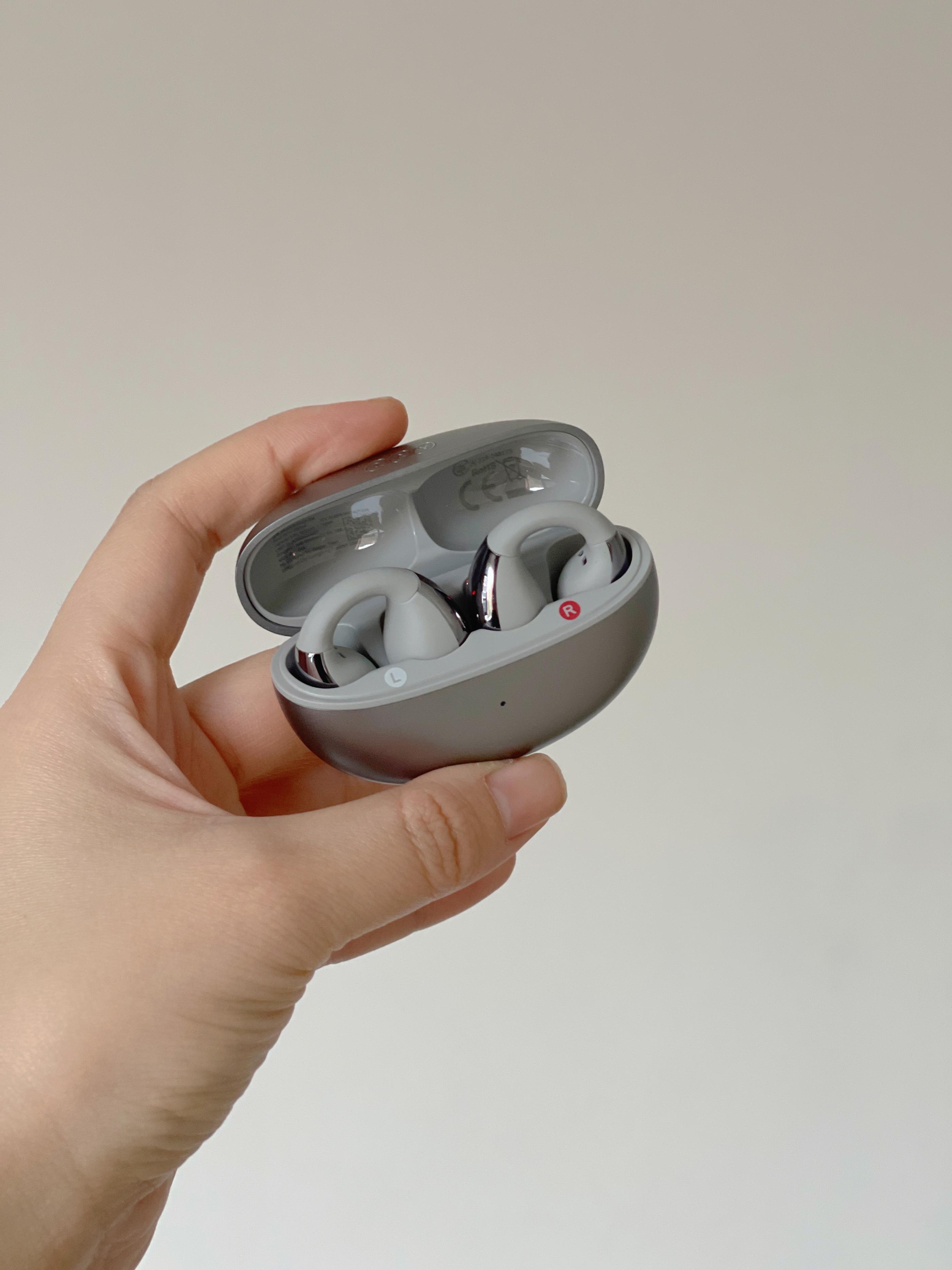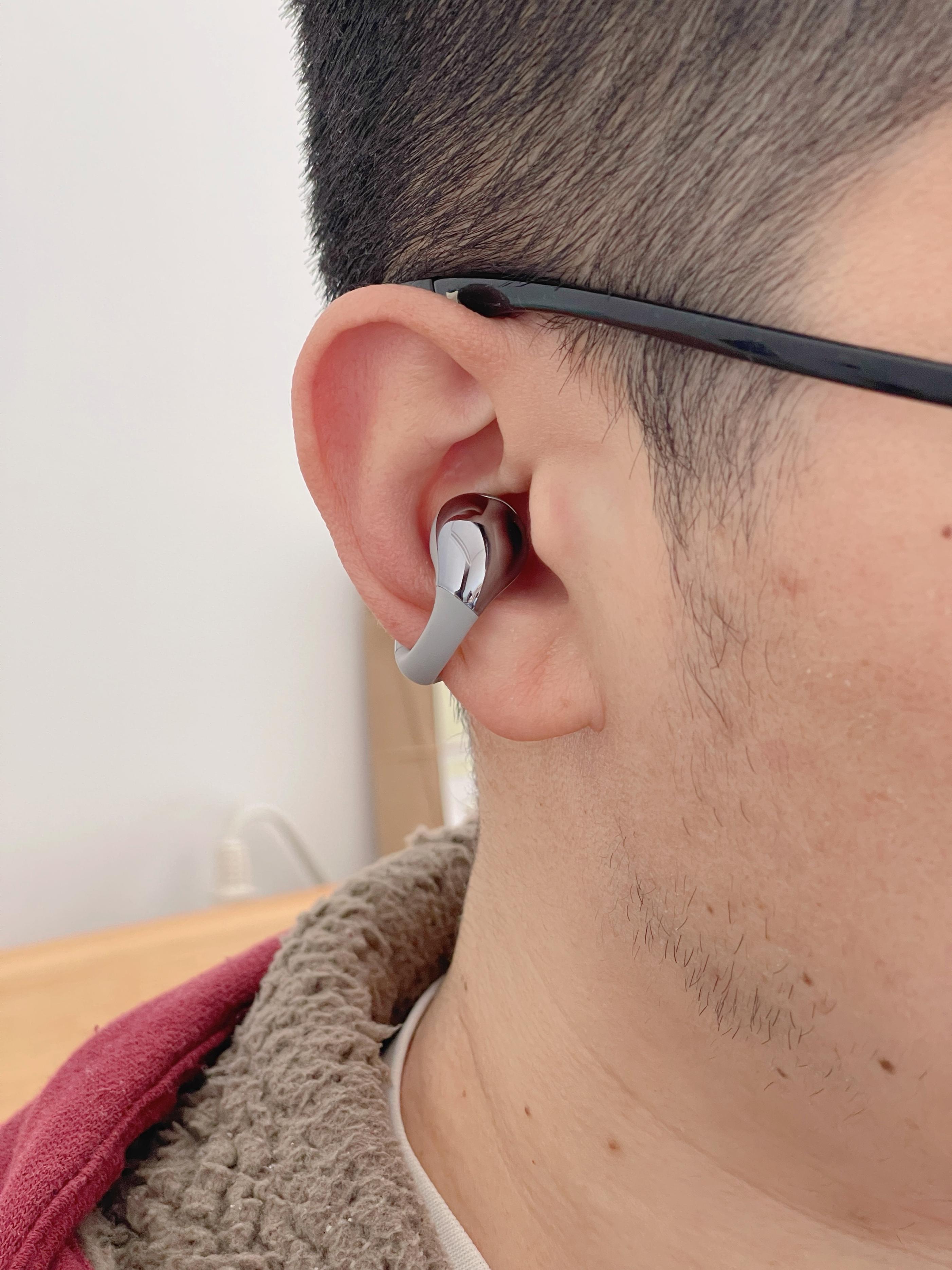 真正引起我好奇的,还是耳机本体的造型。它采用了明显的银色外观,给人一种低调又具金属质感的时尚感。与入耳式、半入耳式都不同,C30S看上去就像两个贴合耳廓的小夹子,体积很轻,似乎戴上后不会产生“坠耳朵”的感觉。拿在手里能够明显感受到它的分量非常轻盈,尤其对比以前使用过的传统真无线耳机,这种“轻量化”让人对佩戴舒适度更加期待。