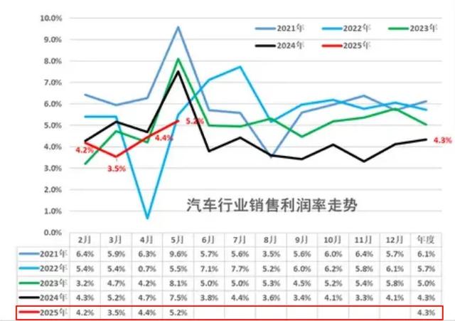 今年1-5月,汽车行业收入虽达4.1万亿,同比增长7%,但成本增加8%,利润下滑11.9%,行业利润率仅4.3%。