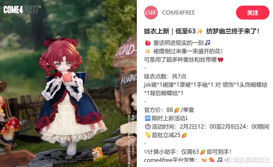 包括SIMON TOYS在内,大多bjd品牌都有自己的娃衣业务。此前,bjd玩偶的衣服大多为动辄数百上千的手工定制,或商家贩卖材料包由玩家自行缝制。但如今,精细成品娃衣的价格被这些bjd品牌打到50-80元,不仅能成为品牌的内容增长点,还能成为它们的核心优势。