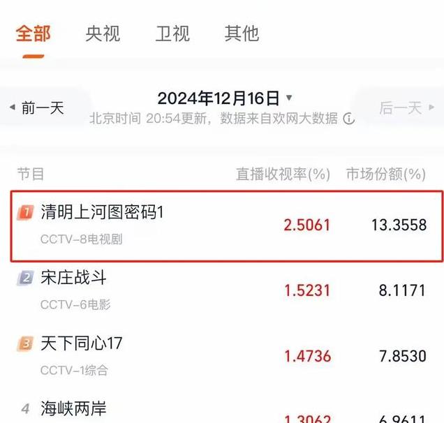 首播成绩太亮眼了,就像一颗特别耀眼的星星挂在影视天空,证明了这部剧品质好、吸引力强。第一集收视率跟疯了似的往上涨,一下子就冲到了 2.5%,稳稳地坐上了全国收视第一名的宝座。现在电视剧市场竞争多激烈啊,观众眼光又高又挑剔,能在首播就拿到这么好的成绩,肯定不是靠运气。跟以前同类型的剧比一比,好多剧首播能有 1%的收视率就不错了,《清明上河图密码》这数据快翻倍了,一看就是要大火的样子。我连着追了两集,心里就认定它肯定能在影视界闹出大动静,留下浓墨重彩的一笔。