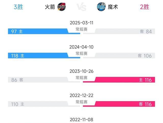 过去5场交手,火箭3:2领先魔术。最近一场,火箭主场击败魔术。魔术最佳球员班凯罗得25分,火箭亚当斯贡献11分17篮板。此役,阿门与范弗里特缺席。