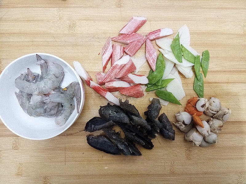 1. 八珍豆腐食材很多,先来处理食材,鲜虾开背去虾线,海参斜着切段,蟹肉棒斜切段、全贝洗净去沙囊、玉兰片切菱形块、为了配色,又切了四个荷兰豆。