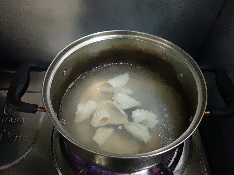 8. 切好的鱿鱼焯水,鱿鱼下水后就自然成卷了,不要焯的时间长了,那样就不嫩了。
