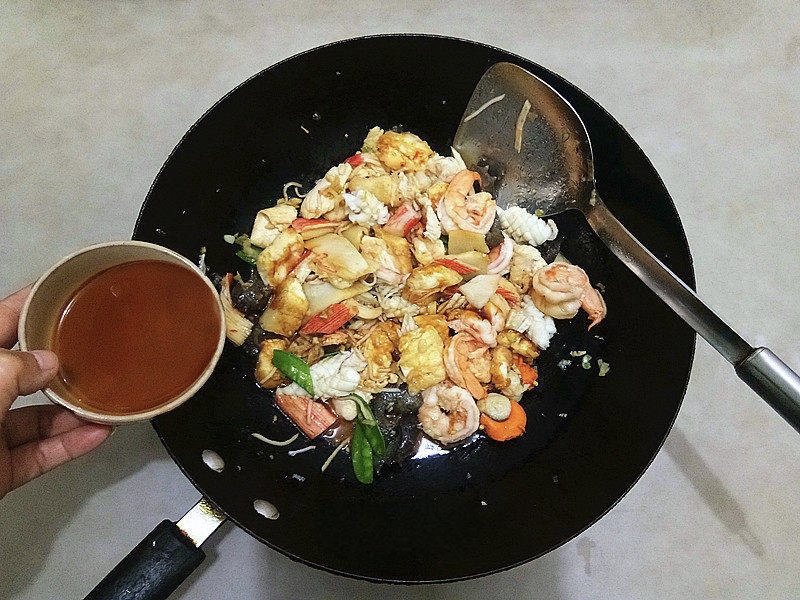 13. 推炒均匀后,用水淀粉勾芡。(天津传统八珍豆腐颜色稍重的,水淀粉中加入1/2茶匙老抽调色)