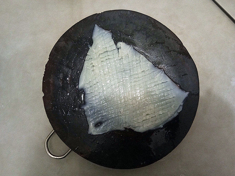 3. 鱿鱼改成花刀(鱿鱼切法:从边角45度开始切斜刀,要注意底部不能切断。然后转过来90度,切直刀,同样底部不能切断,顺着直刀的纹路把鱿鱼改成小块即可)