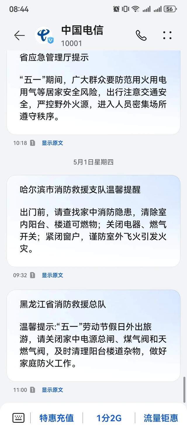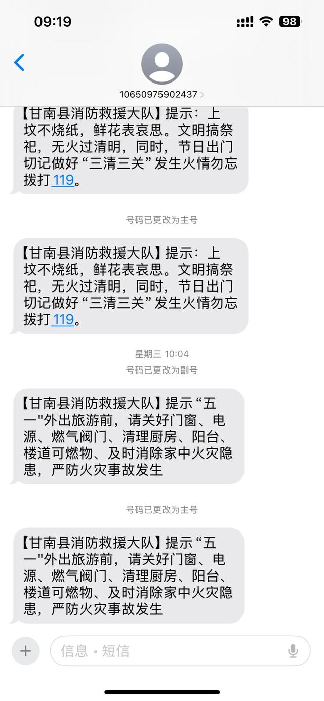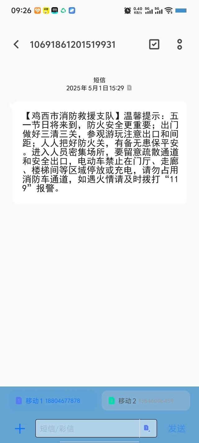 总队协调省通信管理局向全省重点人群发送消防提示手机短信超千万条,结合“五一”假期特点,提醒群众在出行、旅游、购物等过程中时刻注意消防安全,通过精准推送确保消防安全知识及时、有效地传达给目标人群。