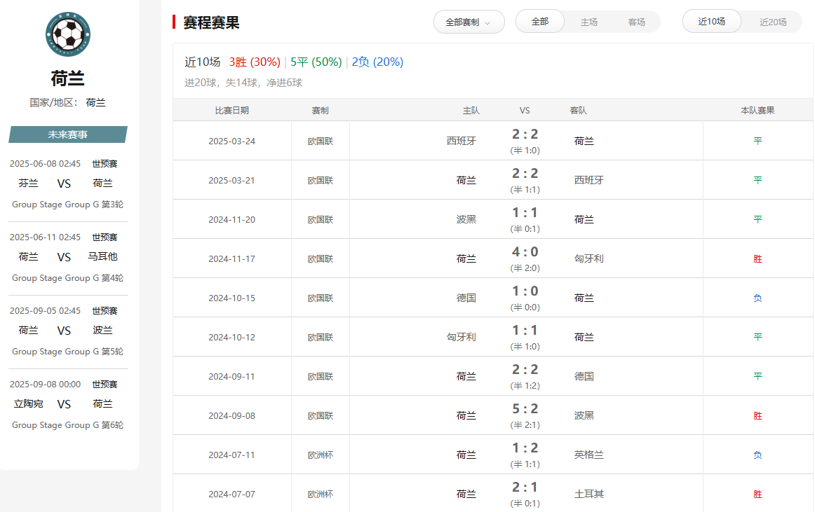 芬兰在本次世预赛中开局尚可,前两轮取得1胜1平的战绩,暂列G组第二。不过,球队近期整体状态并不稳定,近10场正式比赛仅取得1胜2平7负的战绩,场均失球数高达2.1个,防守问题突出。芬兰的战术以防守反击为主,依靠瞬间的转换寻找机会。球队核心普基近3场打入2球,展现出良好的竞技状态。然而,芬兰的防线存在明显隐患,近10场各项赛事丢21球,且防线平均年龄偏大,面对荷兰的快攻恐难招架。此外,芬兰主场表现不佳,近3个主场全败,且场均失球≥2个。