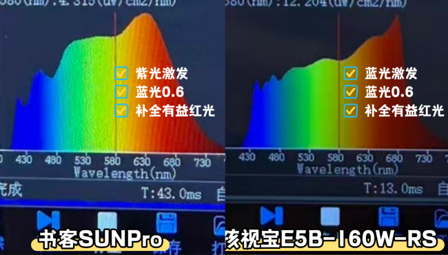 孩视宝E5B-160W-RS:孩视宝蓝光峰值在0.6左右,实际光谱分布比较平缓,并且红光波段比较突出,虽然不具备蓝光伤害,但实际光谱并不接近太阳光。