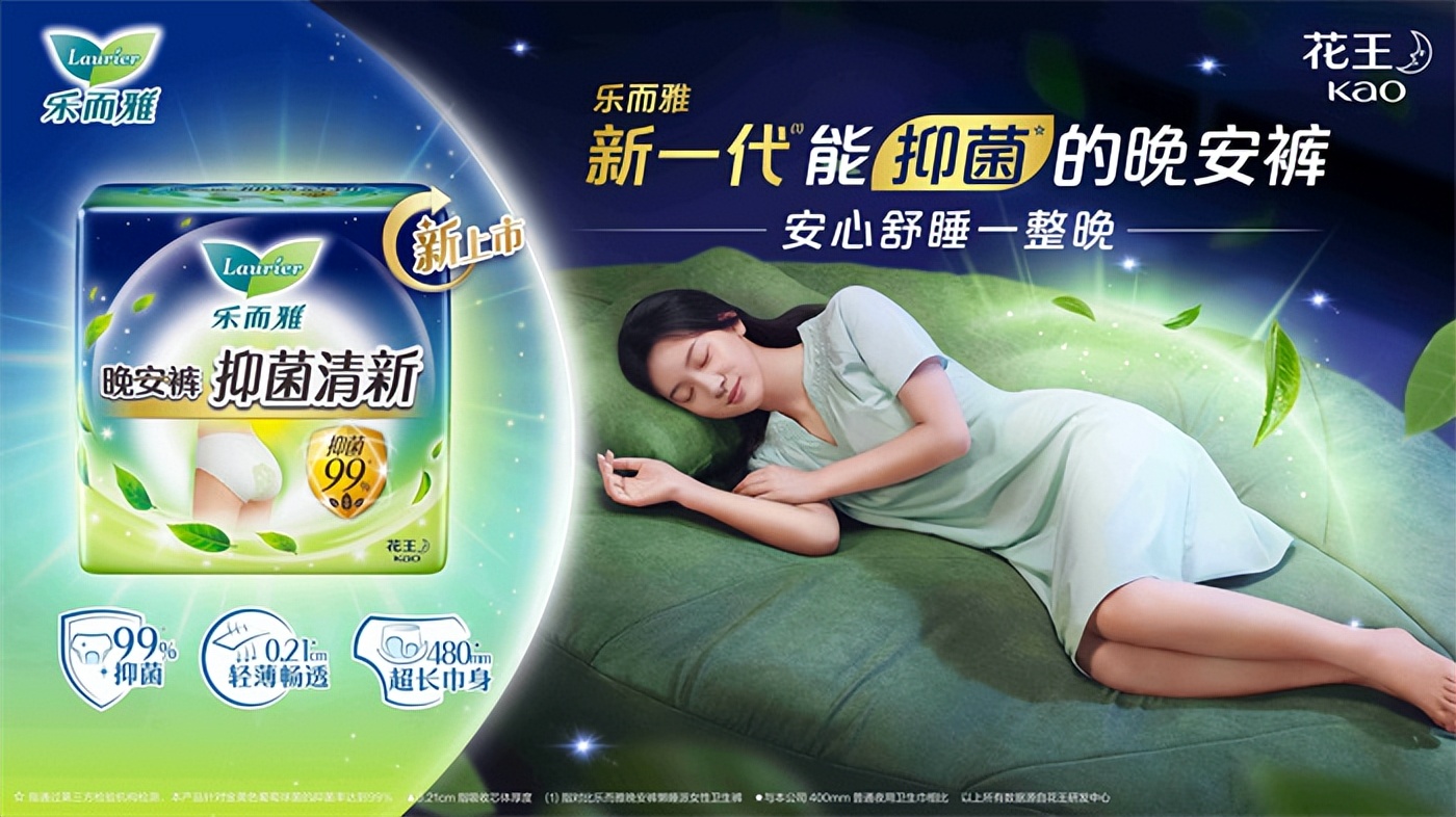 冬夜漫长,温暖厚重的被窝本是幸福所在,却也可能因生理期的到来,成为闷湿与细菌滋生的温床,让人难以安眠。“乐而雅晚安裤抑菌清新” 致力于打造 “安睡结界”,集“抑菌、防漏、透气、劲吸”四重安心“守护力”于一体,如同一道轻柔的“防护光环”,从源头守护洁净干爽,让你“安心舒睡”一整晚。