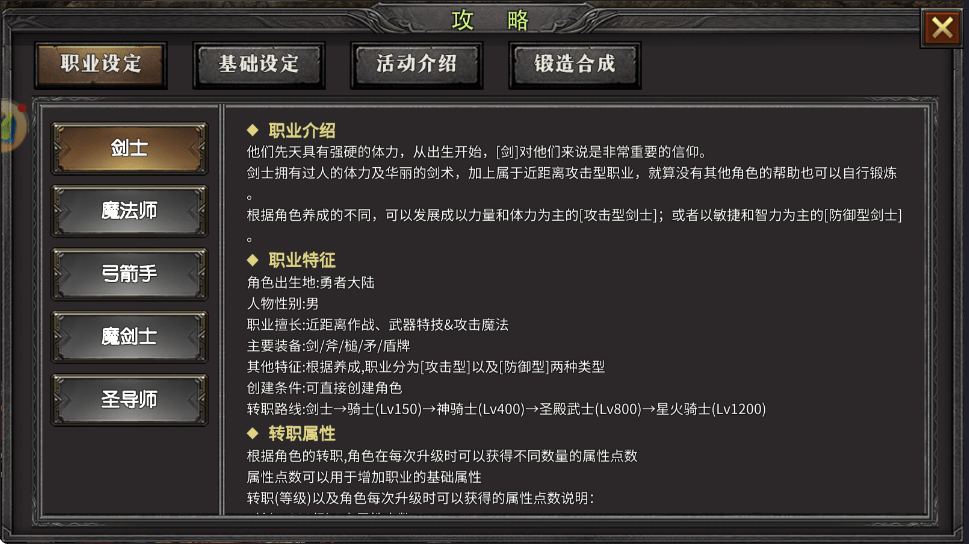 剑士:近战攻防一体,血厚防高,操作简单,容错率高,是新手开荒与团队前排的理想选择。核心属性为力量、体力、敏捷,前期可兼顾输出与生存,后期可转型为纯输出或抗伤流。