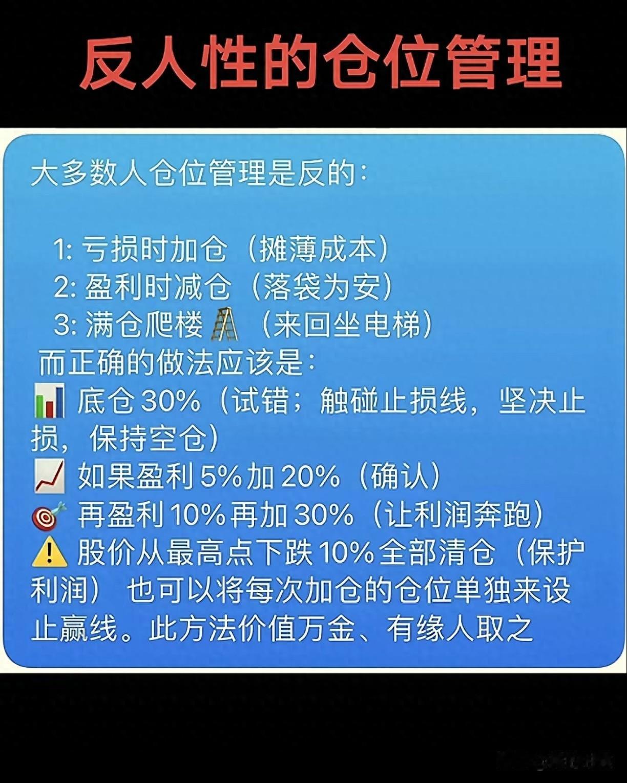 我见过太多人炒股时,仓位管理搞得一团糟。今天我们就用大白话聊聊这个事。很多人仓位管理完全是反的。亏了死命加仓,觉得能摊薄成本。赚了点赶紧卖,美其名曰落袋为安。股价高位时满仓躺平,指望它一直涨。这三种操作,乍一看挺有理,实则是在埋雷。