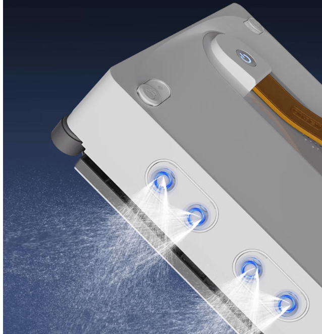火鲸H9Pro擦窗机器人采用近似正方形的轮廓,而非圆形。这种设计能在清洁时更贴近直角窗框,减少四角的清洁盲区,拿在手中感觉更像一个稍厚的平板电脑,而非传统擦窗机器人的“小方盒”形态,内置算法,能自动规划“N”字形或弓字形路径,确保覆盖率高,并能智能识别窗框,自动沿边清洁。采用四向喷水设计,能有效溶解顽固污渍,适合处理雨水痕、灰尘等常见污垢。四种清洁模式,陈年污渍也能一擦而净,清洁面积达到99%,边角擦得也很干净,高频微气泡喷水,不伤玻璃去渍不留痕。