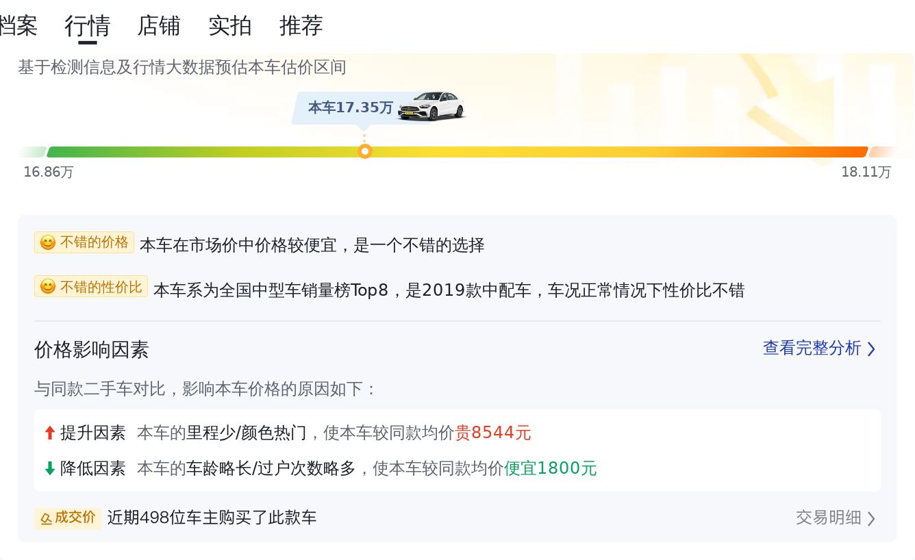 在价格部分,影响二手车定价的因素众多,包括车辆的使用年限、行驶里程、过户次数及外观颜色等。就拿这辆车说,里程少于均值2.3万公里,车龄多于均值0.1年,过户次数多于均值0.3次,颜色为白色。