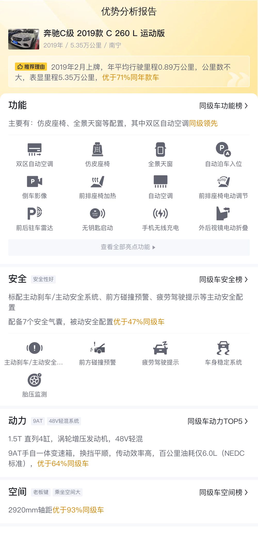 这辆车的具体版本是——奔驰 C 级 2019 款 C 260 L 运动版,首次上牌时间为 2019 年 2 月,有过 1 次过户记录,目前牌照所在地是马鞍山,车源所在地是南宁,车身颜色为白色,当前行驶里程为 5.35 万公里。新车指导价为 35.08 万,现在的二手车报价为 17.35 万。