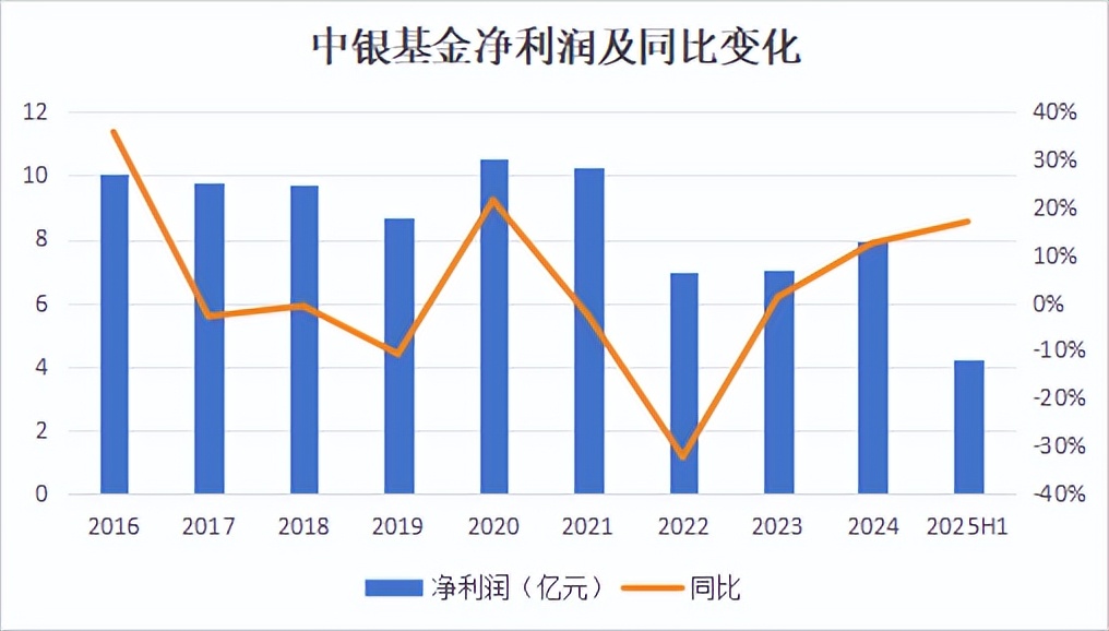 中银基金在近两年展现出较强的盈利韧性,2024年净利润7.9亿元,同比增长12.54%;2025年上半年净利润4.2亿元,同比增长16.99%。这一方面得益于其在固收与被动产品线上的稳定贡献,另一方面也反映出公司在成本控制与运营效率上的提升。
