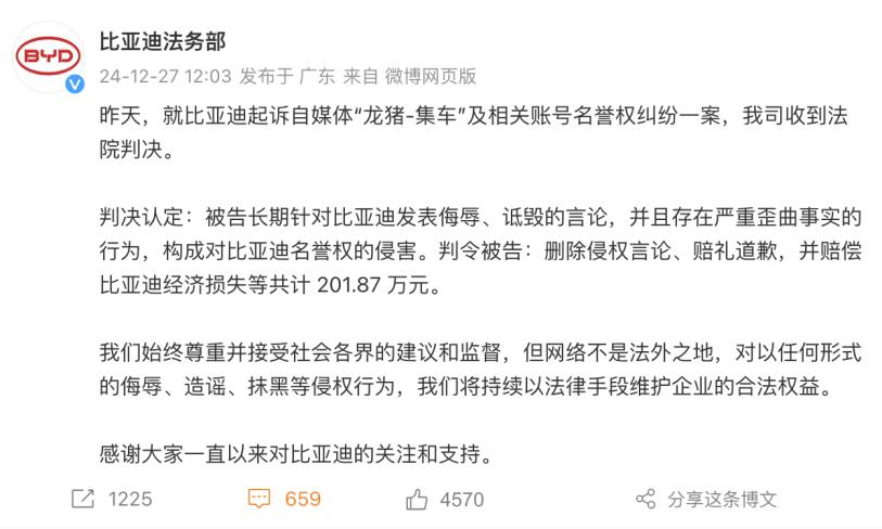 据悉,在近两年的时间里,比亚迪累计起诉20余个“黑号”,同时对30多个重点“黑号”进行密切关注,对其发布的内容及评论区持续做证据保全。值得关注的是,2024年年底,比亚迪起诉自媒体博主“龙猪-集车”的名誉纠纷权案胜诉,其长期侮辱、诋毁比亚迪,构成名誉侵权,法院判决“龙猪-集车”删除侵权言论、公开赔礼道歉,并赔偿201.87万元。