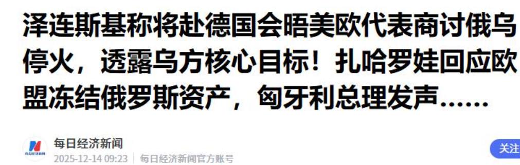 参考信息:每日经济新闻——2025年12月14日——泽连斯基称将赴德国会晤美欧代表商讨俄乌停火,透露乌方核心目标!扎哈罗娃回应欧盟冻结俄罗斯资产,匈牙利总理发声……