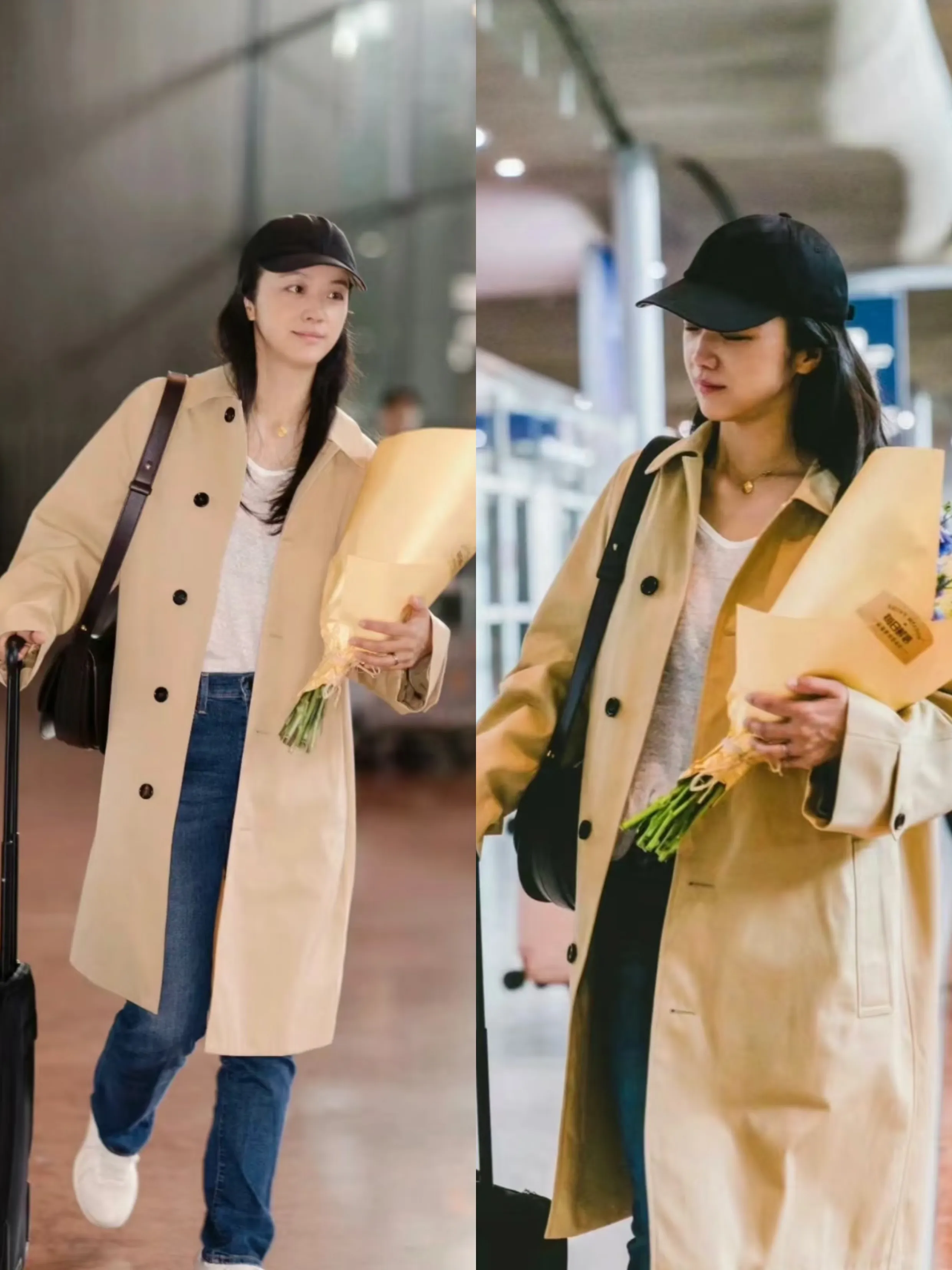 文艺女神汤唯简直时风衣的神!每次穿风衣,都能让人眼前一亮!下面这套搭配尤其适合普通人借鉴!设计简约的单排扣风衣,H型设计,不挑身材!内搭一件白色圆领T恤,露出脖颈线条,下半身搭配蓝色牛仔裤和小白鞋,很春天的搭配。