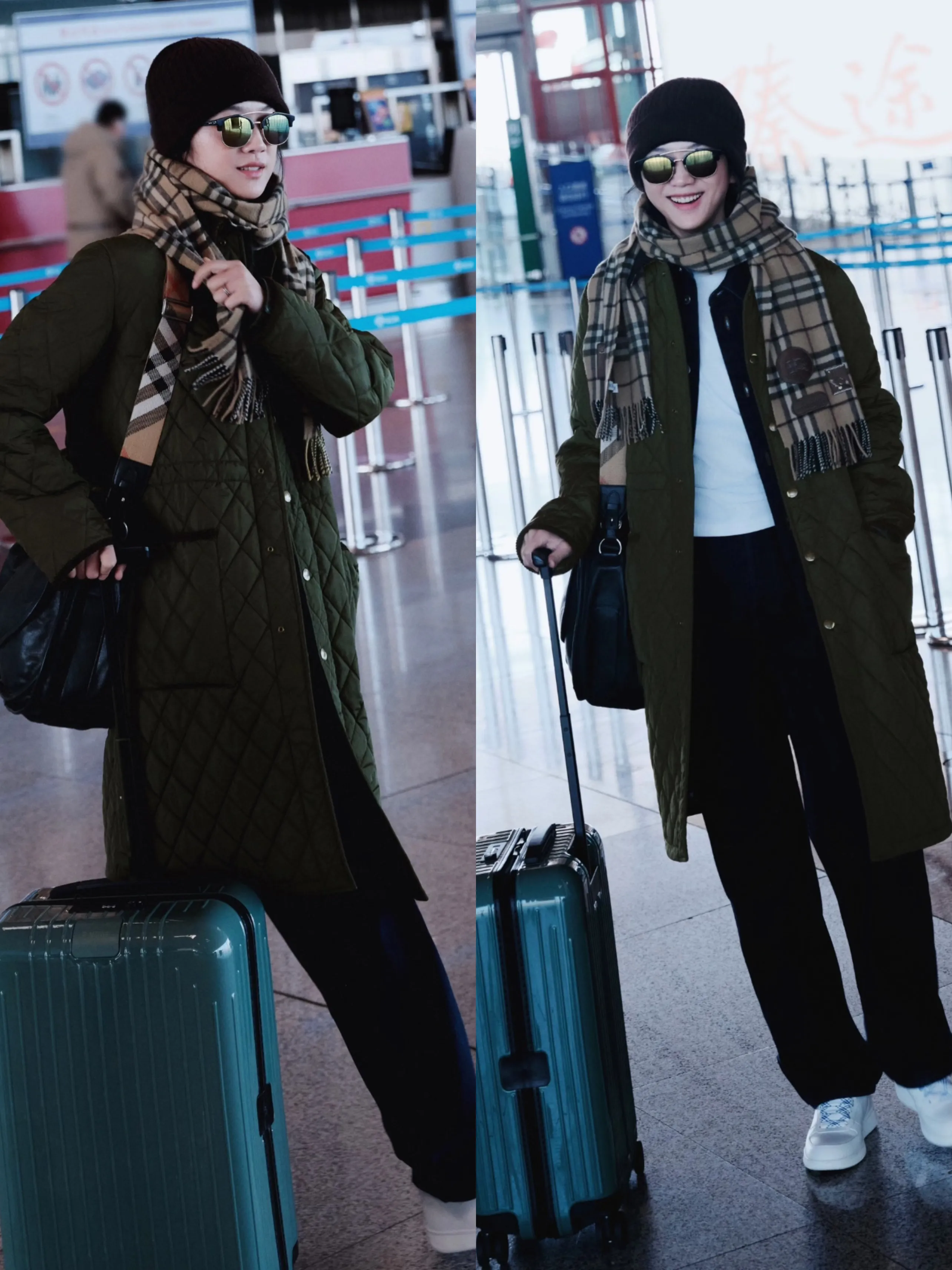 绿色非常适合有文艺气息的女生!内搭蓝色牛仔外套和白色T恤,叠搭展现她的时尚品味!搭配黑色冷帽和格纹围巾,笑容依然那么具有感染力!搭配牛仔裤和小白鞋,充满活力的早春穿搭!