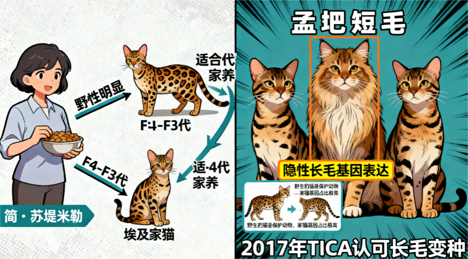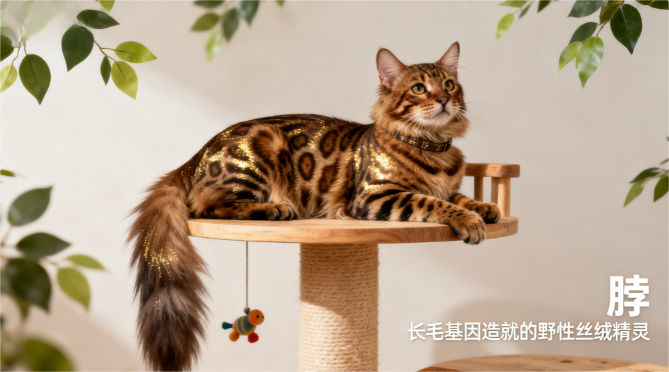 孟加拉长毛猫的出现则是繁育过程中的意外惊喜:在孟加拉短毛猫的纯种繁育中,部分个体因携带隐性长毛基因(由一对常染色体隐性基因控制),后代偶尔会出现被毛明显变长的个体。最初这类长毛个体因不符合短毛品种标准被淘汰,直到 2000 年后,部分繁育者发现其长毛与豹纹结合的独特美感,开始系统性选育 —— 通过将携带长毛基因的孟加拉短毛猫进行配对,稳定遗传性状,最终形成独立的孟加拉长毛猫品系。2017 年,国际猫协会(TICA)正式将其纳入孟加拉猫品种的长毛变种,认可其作为独立展示类别,如今已成为高端宠物市场中备受追捧的 “稀世珍品”。