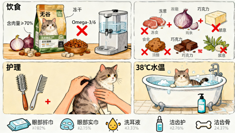 环境控制:提供宽敞活动空间,配备高猫爬架、益智喂食器等,满足其运动与智力需求;保持居所干燥通风,湿度控制在 50%-60%,洗澡后务必彻底吹干毛发;猫砂盆选择大号敞口式,每日清理排泄物,避免泌尿系统问题。