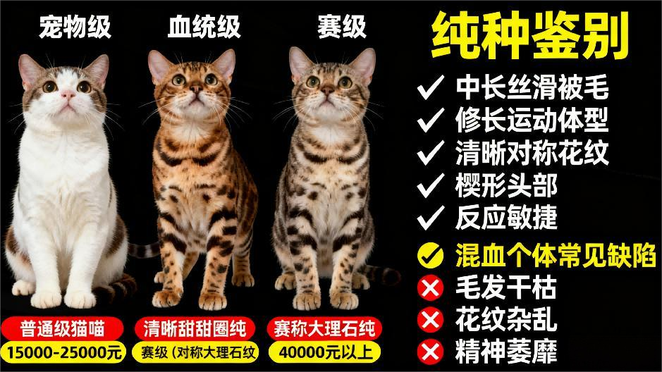 价格参考:纯种孟加拉长毛猫因稀有性价格较高,宠物级 15000-25000 元,血统级 25000-40000 元,赛级(花纹完美、符合标准)40000 元以上,过低价格(低于 10000 元)多为混血个体,长毛特征与花纹均不稳定。