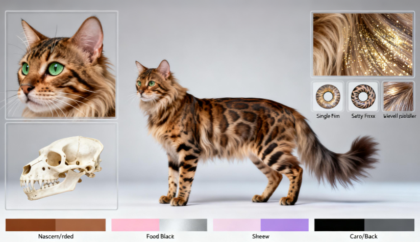 被毛:这是其最核心的识别特征 —— 全身被毛为中长长度,外层毛丝滑柔韧,内层绒毛细密蓬松,颈部与尾部毛量更丰厚,形成自然的 “围脖” 与 “ plume 状尾”;被毛最大亮点是独特的豹纹花纹,分为点状纹与大理石纹两大类:点状纹包括单点纹、簇状纹、甜甜圈纹(外圈闭合的玫瑰纹,最接近美洲豹花纹)等 7 种,大理石纹则有水平纹、乱纹等 6 种,其中牛眼纹是繁育中需剔除的缺陷纹;毛色涵盖标准的棕色、银色、雪色(含海豹山猫重点色等亚型)及非标准的黑色、炭色等,毛发毛尖多呈半透明状,在光照下会呈现 “金粉光泽”,裸露皮肤为粉色或黑色,鼻镜与足垫颜色随毛色匹配。