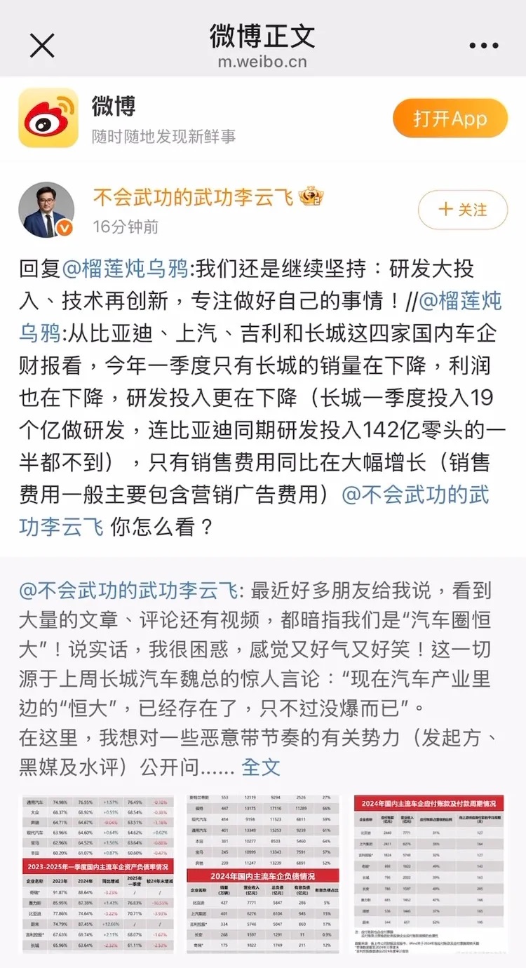 一石激起千层浪,这两天被车圈恒大刷屏了,很多人甚至把这个帽子扣到比亚迪头上,比亚迪直接甩出财报数据,用事实说话,让这些谣言不攻自破。咱们先来看看比亚迪的财务数据。2024年,比亚迪的营收达到了惊人的7771亿元,同比增长29%。归母净利润也达到了402.5亿元,同比增长34%。这样的财务数据,足以证明比亚迪的盈利能力有多强。而且,比亚迪的研发投入也高达542亿元,同比增长36%,远超同期净利润。这说明比亚迪在技术创新上可是下了血本的。再看看现金储备,比亚迪有1549亿元的现金储备,而有息负债却只有285.8亿元。这样的财务状况,简直稳健得不能再稳健了。那些说比亚迪是“车圈恒大”的人,财务知识严重缺乏呀,恒大是什么情况?高负债、低现金流、资金链断裂。而比亚迪呢?低负债、高现金流、财务稳健。这能比吗?比亚迪的有息负债在总负债中的占比只有4.9%,处于行业最低水平。这说明比亚迪的负债结构非常健康,根本不存在什么资金链断裂的风险。再看看市场表现,比亚迪2024年全球销量达到了427万辆,同比增长41%。在中国市场,比亚迪更是以161.3万辆的销量位居榜首。新能源汽车的渗透率也超过了52%,购买新能源汽车已经成为主流。而且,中国汽车连续两年出口全球第一,很多中国品牌在海外成绩耀眼。比亚迪在海外市场的表现也非常强劲,今年以来在海外很多国家及主流市场全面爆发,就连欧洲老牌汽车强国的地盘,比亚迪也取得了各种突破,更是直接把欧洲总部落户匈牙利。比亚迪之所以能够取得这样的成绩,离不开人家强大的技术实力,比如刀片电池、第五代DM、e平台3.0 Evo、CTB电池车身一体化、易四方、云辇、天神之眼等。这些技术的研发和应用,让比亚迪的产品在市场上具有很强的竞争力。而且,比亚迪还非常重视人才培养,拥有近11万名工程师,研发人才占比近80%。这样的技术实力和人才储备,让比亚迪在未来的发展中充满了无限可能。那些恶意中伤比亚迪的人,到底安的什么心?比亚迪用数据证明自己,用技术赢得市场,这才是中国车企该有的样子!中国汽车走到今天何其不易,黑子们,不要再给民族工业拖后腿了。