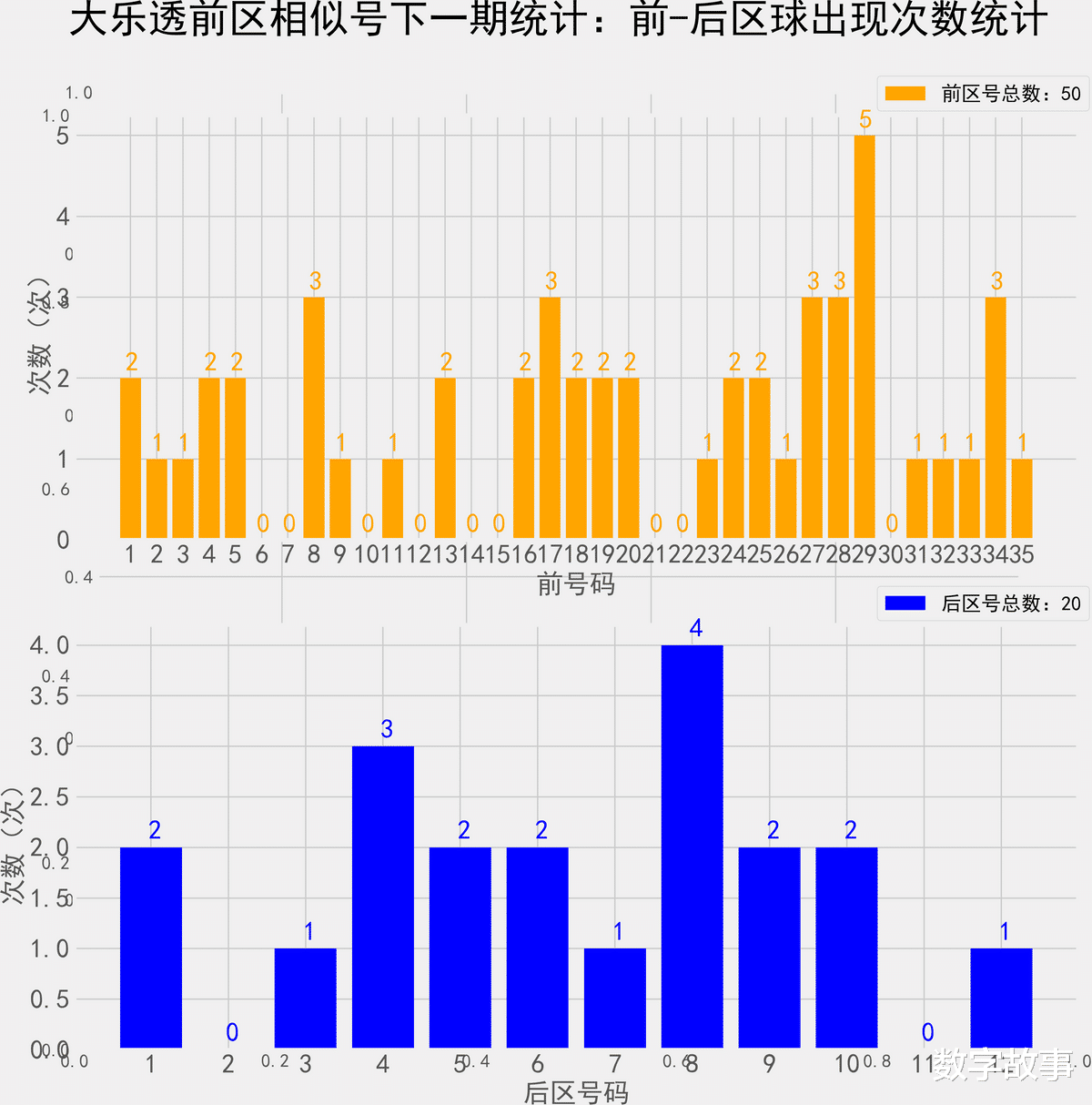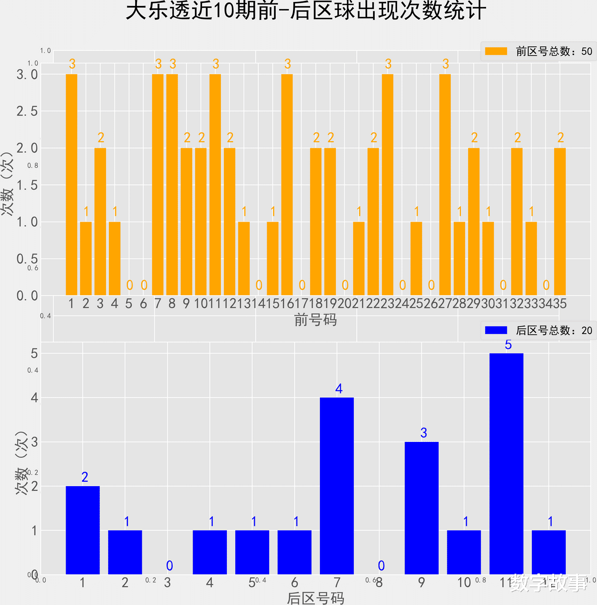 大乐透近10期前后区号统计情况统计样本数据: 50个前区号码 20个后区号码