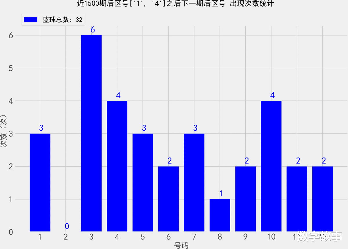 统计近1500期后区号1-4之后, 各后区号的出现次数大乐透25139期后区号是1-4找出近1500期后区1-4号之后,下一期出现的所有后区号,统计其出现次数。除开这一期,共出现了16次1-4后区号那么统计的样本数据是32个