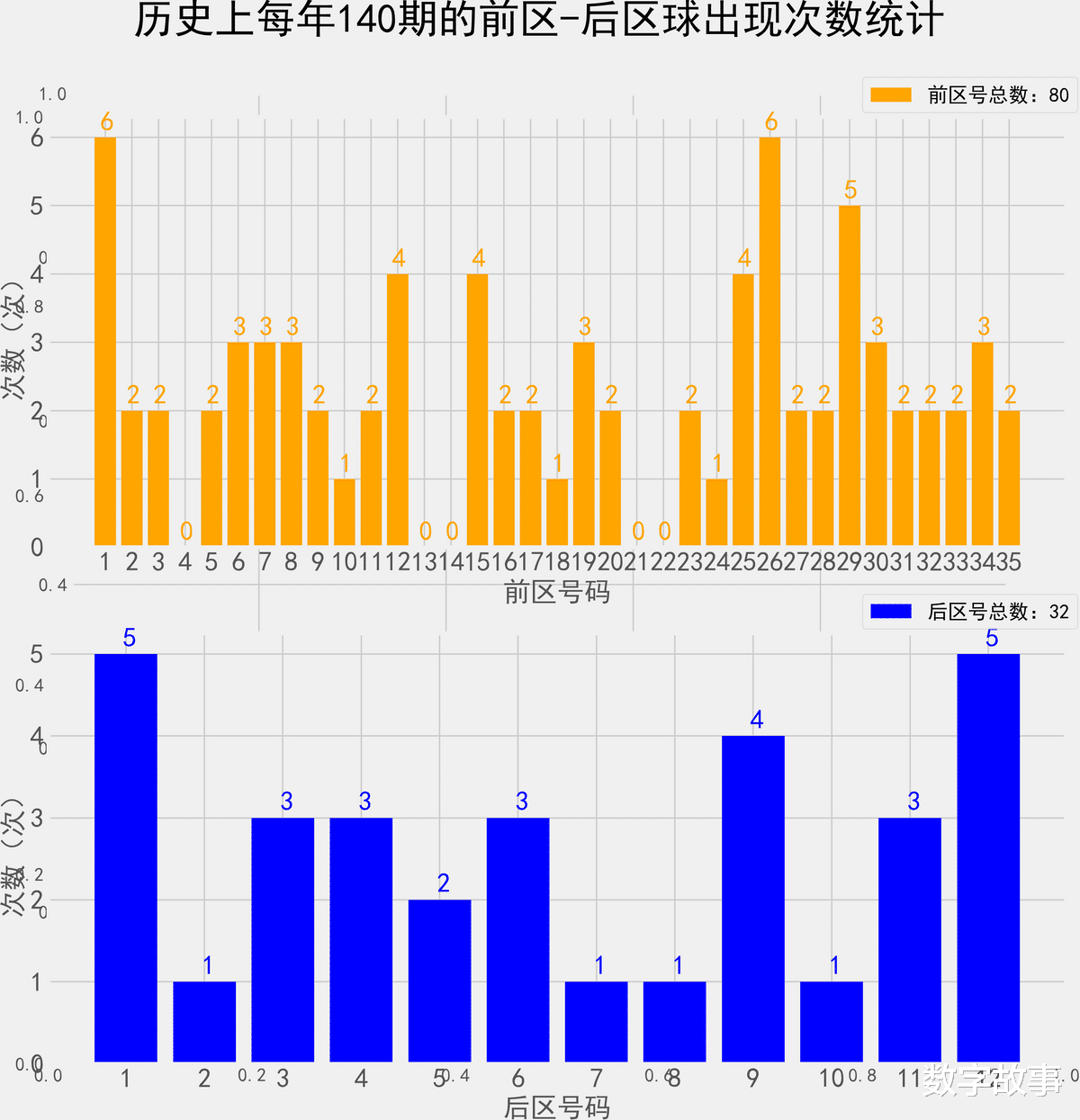 统计每年140期的样本数据: 80个前区号 32个后区号