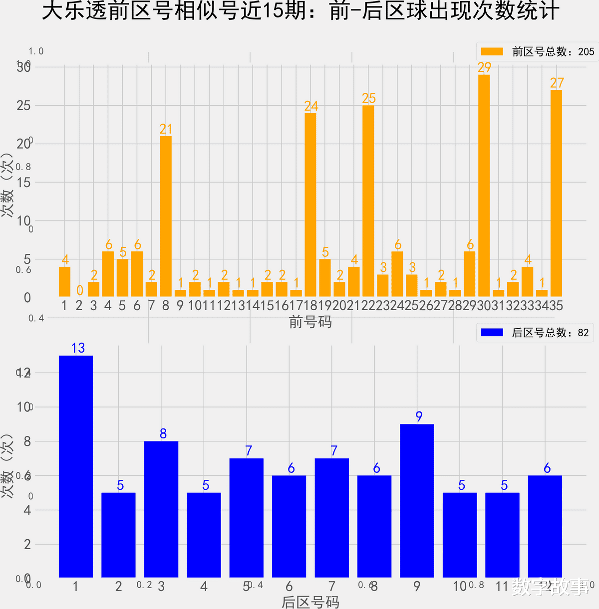 大乐透近100期前后区号统计情况统计样本数据: 500个前区号码 200个后区号码