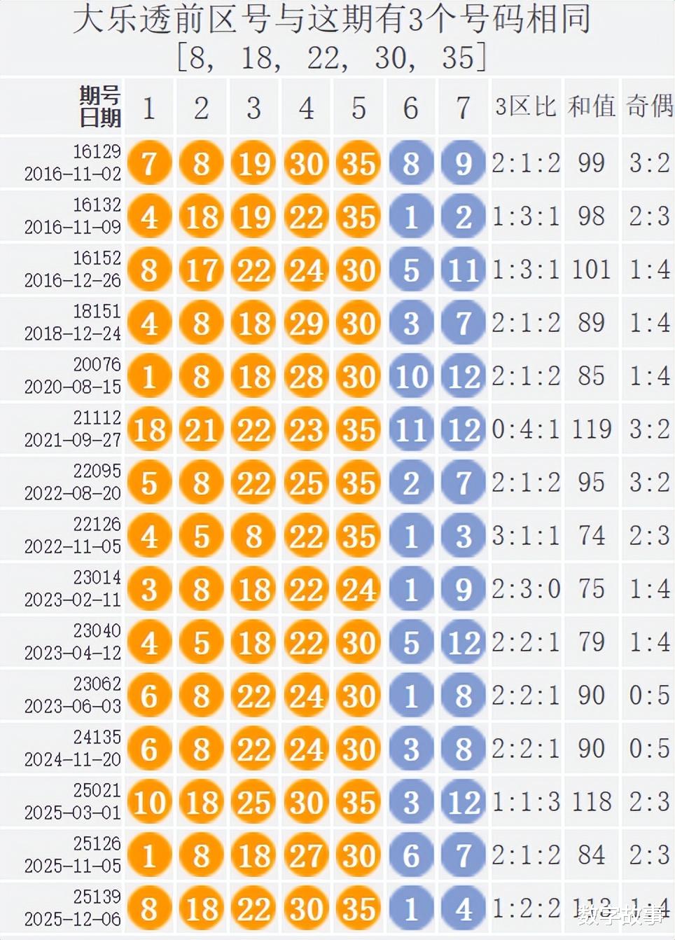 大乐透25139期前区号在过去是否出现过?大乐透25139期前区号: 8-18-22-30-35经查,历史上没有出现过与这一期5个前区号一样的,4个前区号一样的有1期,如下: