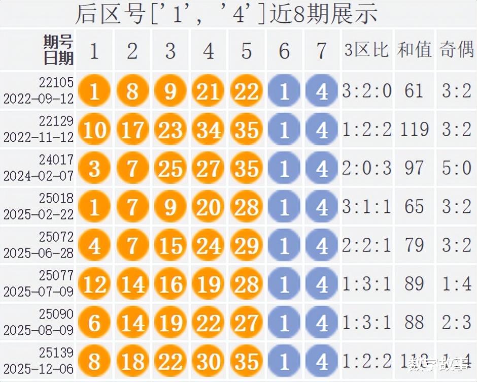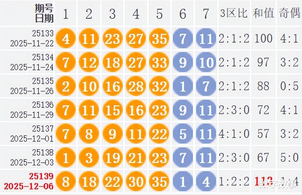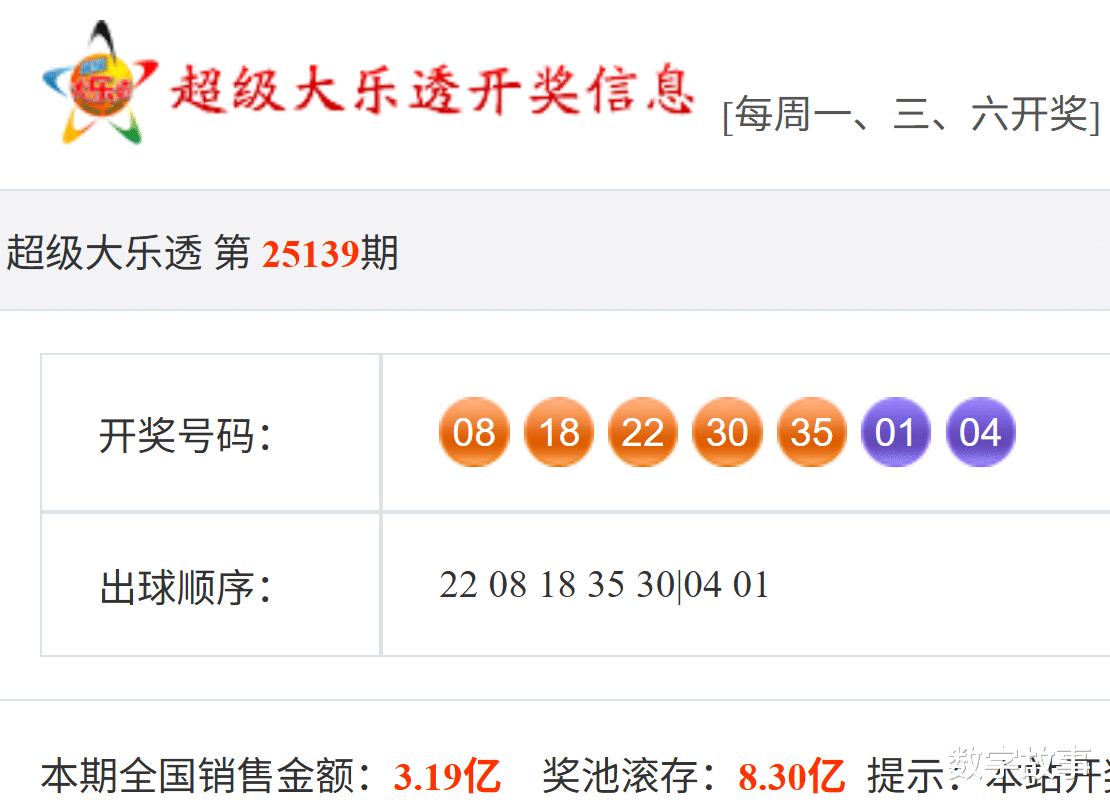 大乐透25139期开奖结果及中奖情况:出奖时间: 2025-12-06 星期六 前区号:8-18-22-30-35后区号:1-4大乐透前区隔期下落:8, 22前区奇偶比:1:4 前区和值:113前区跨度:27 三区比:1:2:2没有连号