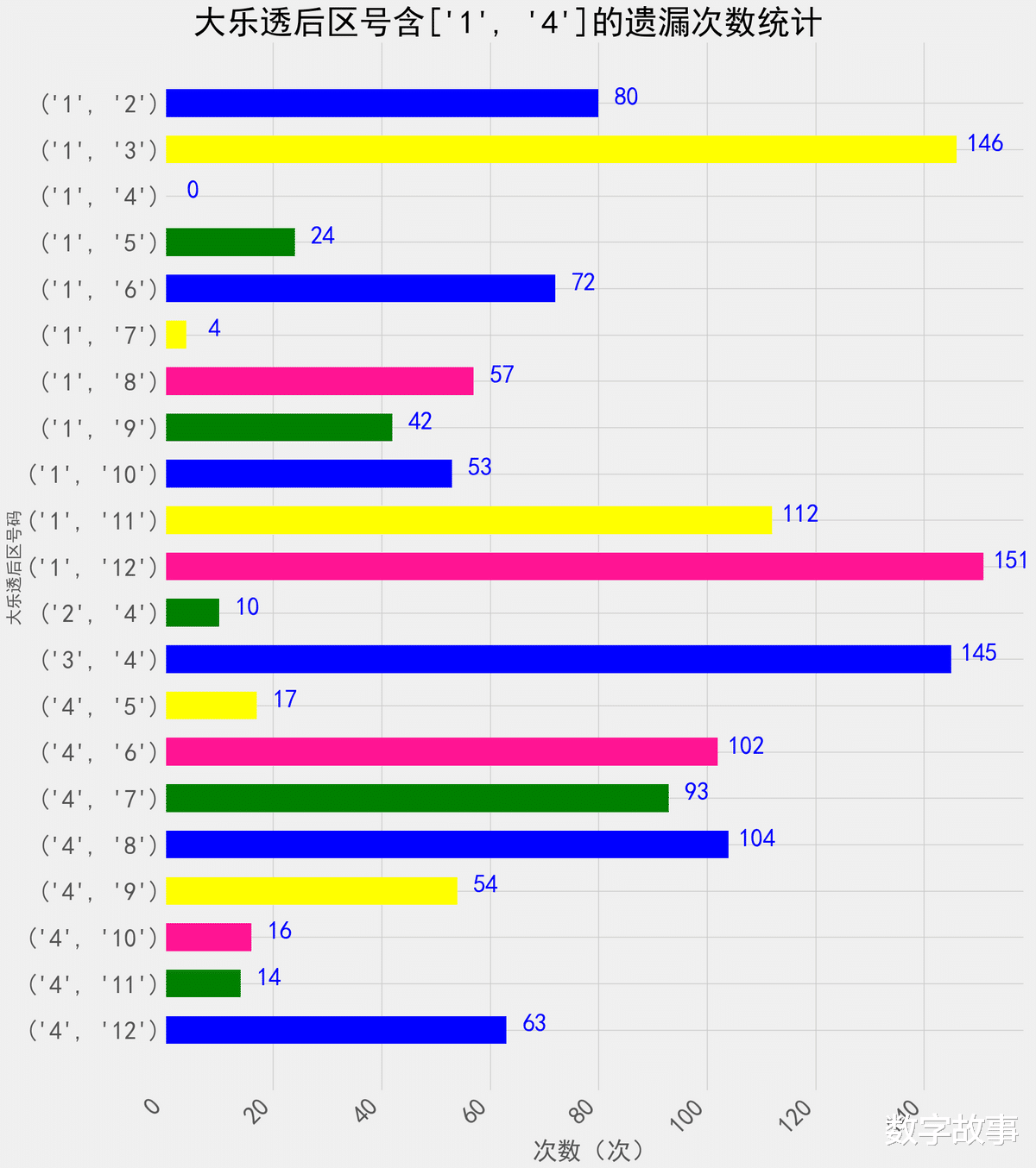 大乐透后区含1或4的双号遗漏次数统计大乐透后区组合1-4近150期出了5次,这次中断了48期遗漏。