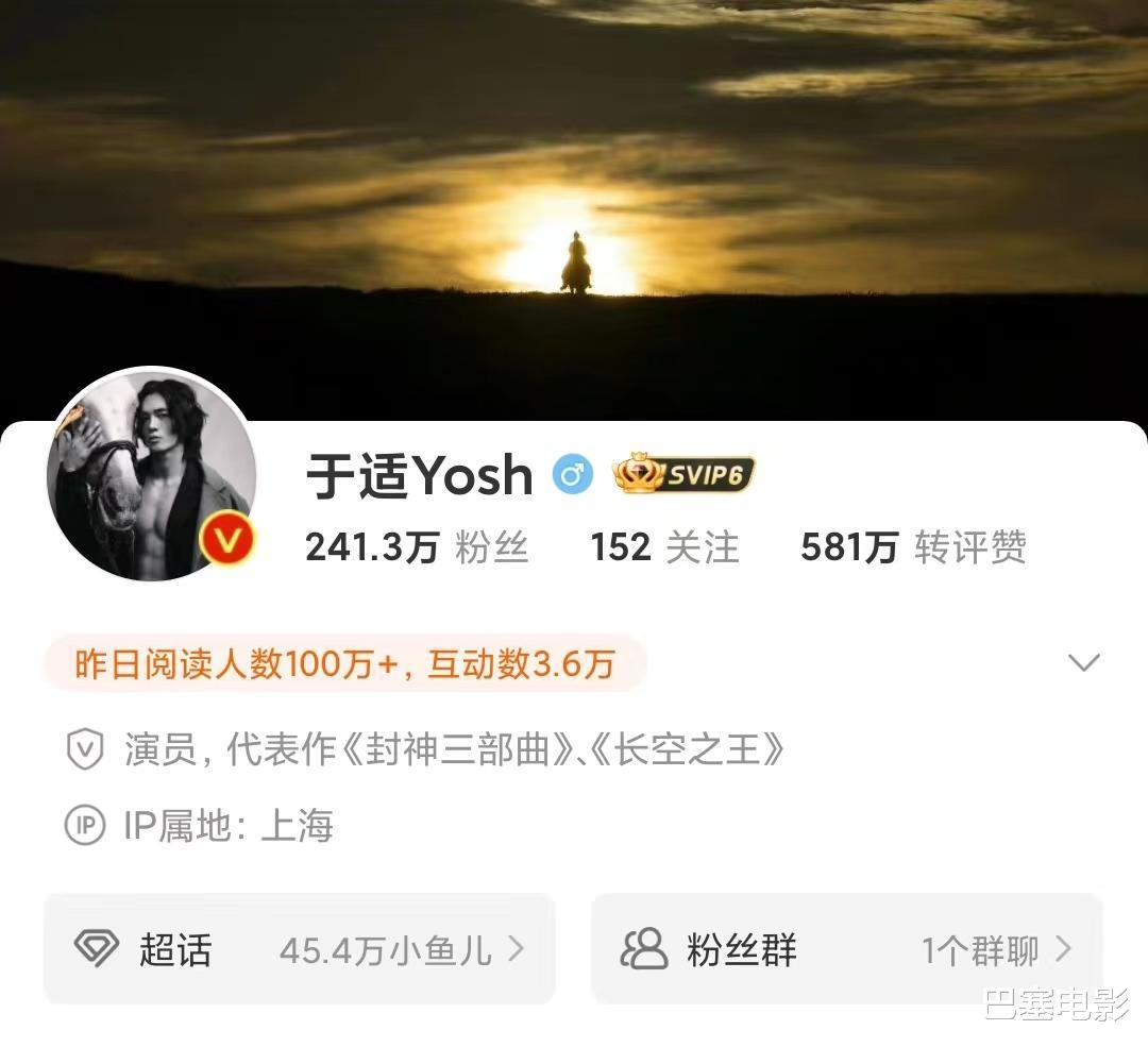 自从《封神》上映以来,于适在某一社交平台的粉丝数量迅速破百万,而后更是有着每月100W+的涨粉趋势。
