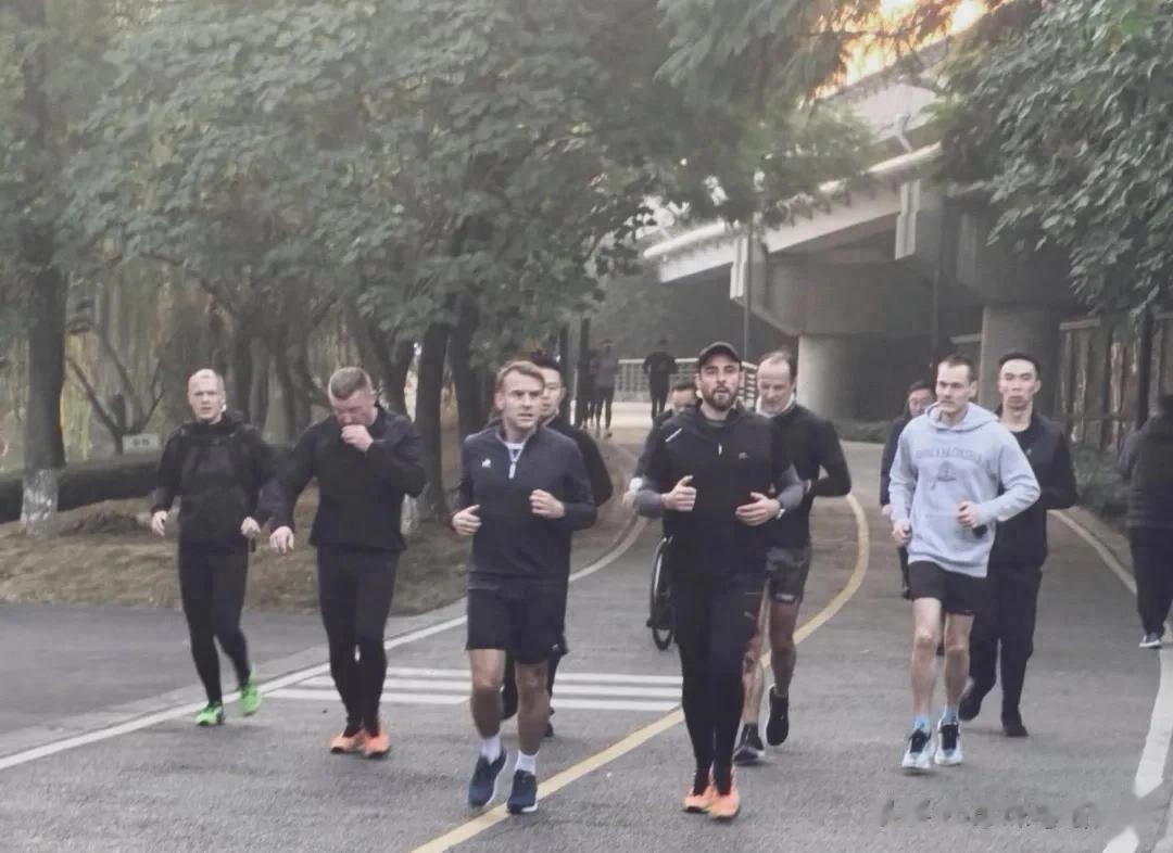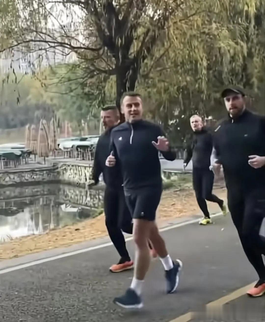 12月5日,法国总统马克龙到访的第三天来到成都,一大早这位47岁的总统在随行人员的陪伴下出现在成都锦城湖公园晨跑。