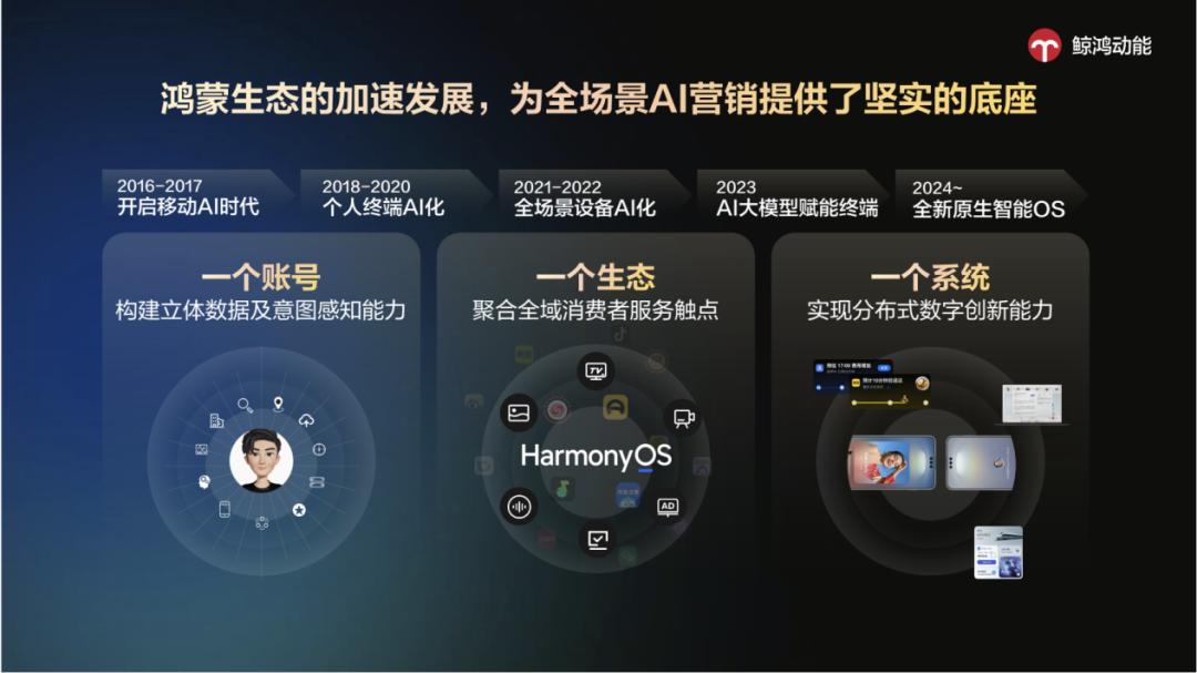 作为依托鸿蒙生态的全场景智慧营销平台,鲸鸿动能正在改变游戏规则,它是依托华为“1+8+N”全场景硬件生态、统一账号体系,以数据科学和全场景 AI 双驱动,在用户高专注、高需求的场景精准触达,并伴随用户全旅程,助力品牌从“流量争夺”,转向“场景深耕”的营销模式。
