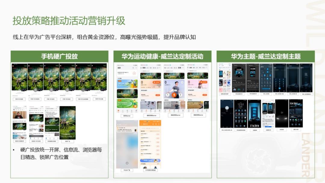通过接入华为运动健康 App,威兰达发起“28 天燃卡挑战赛”,将品牌与运动、探索、户外等积极生活方式建立长期关联;在华为主题商店中,定制主题、亮屏和充电特效,让品牌形象在用户高频使用的设备中反复出现;同时,联动安踏、南航等品牌,围绕“衣食住行”构建完整的户外体验网络,把一次活动做成了一次高净值人群的户外社交。
