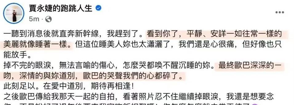 综上所述,好友贾永婕发文还原的大S临终场面让我们深感悲痛和无奈。然而,从这一事件中,我们也看到了友谊、爱情以及生命的美好与脆弱。每个人的生命都是独一无二的,每一个瞬间都值得被铭记。