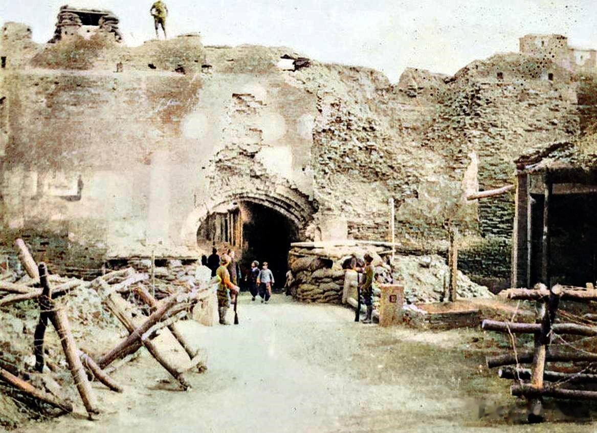 大定门是安阳的西门,位于古城西部偏南方位,取 “定国安邦” 之意。此时的西门外建有日军的工事,路边摆放着带有铁丝网的拒马,并有持枪士兵的站岗。