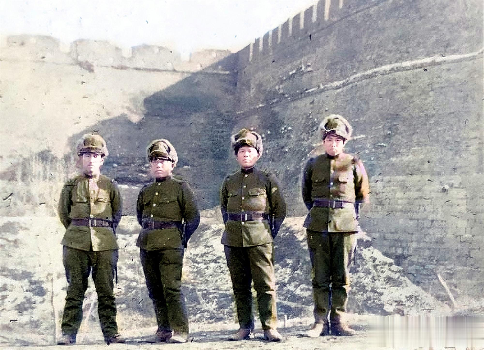 站在安阳城墙下的四个鬼子兵,一个个背着双手,摆出一副不可一世的架势。因为身材不高,看着并不威风。