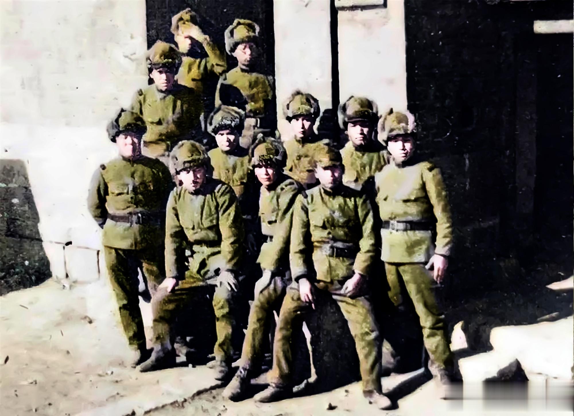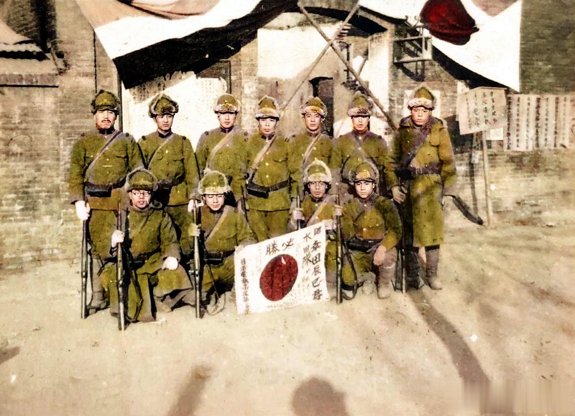 第一通讯所一共有十一个鬼子兵,图为他们在通讯所院子里的合影。蹲在前排中央的两个鬼子扯着一名膏药旗,上面写着“必胜”等字样。