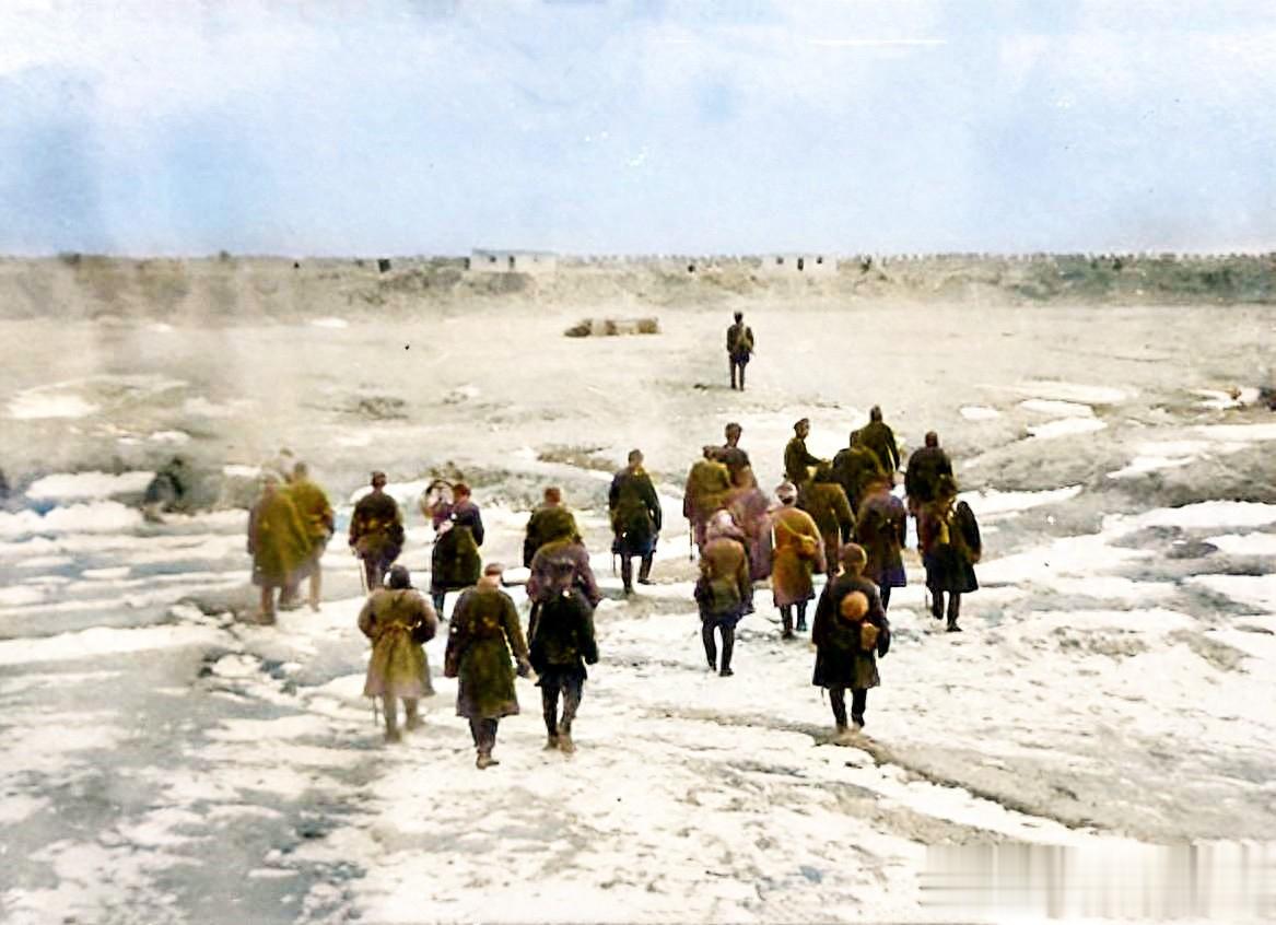 正在帮助日军修建工事的当地苦力,采用最原始的肩挑手提的方式,一个个衣服破烂不堪。他们被迫给鬼子干活,只能得到极少的报酬,有时甚至分文没有。