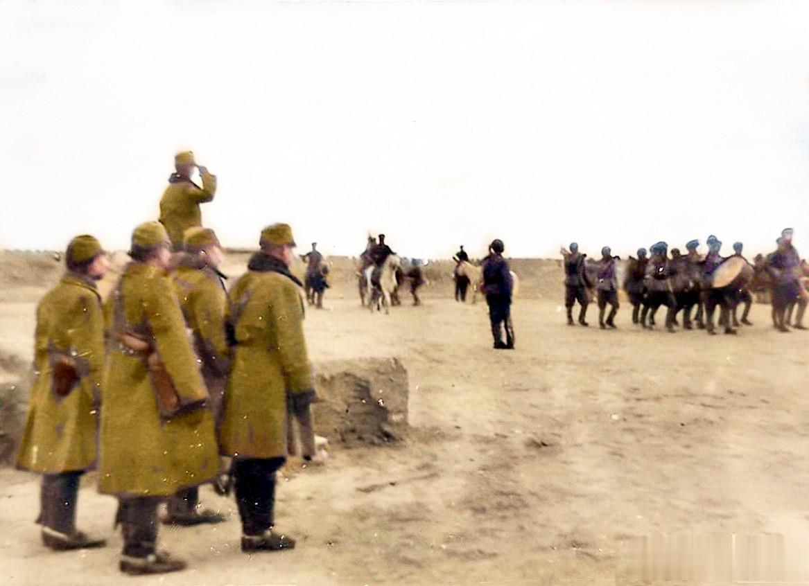 日本军官站在观礼台上检阅列队通过的伪军部队。这些伪军隶属于大汉奸李英的第一路军。此时敲锣打鼓、吹着喇叭看似威风八面,两年后,在安阳战役中,这支队伍被我太行军区的八路军打得落花流水,有三分之二的伪军被歼灭。