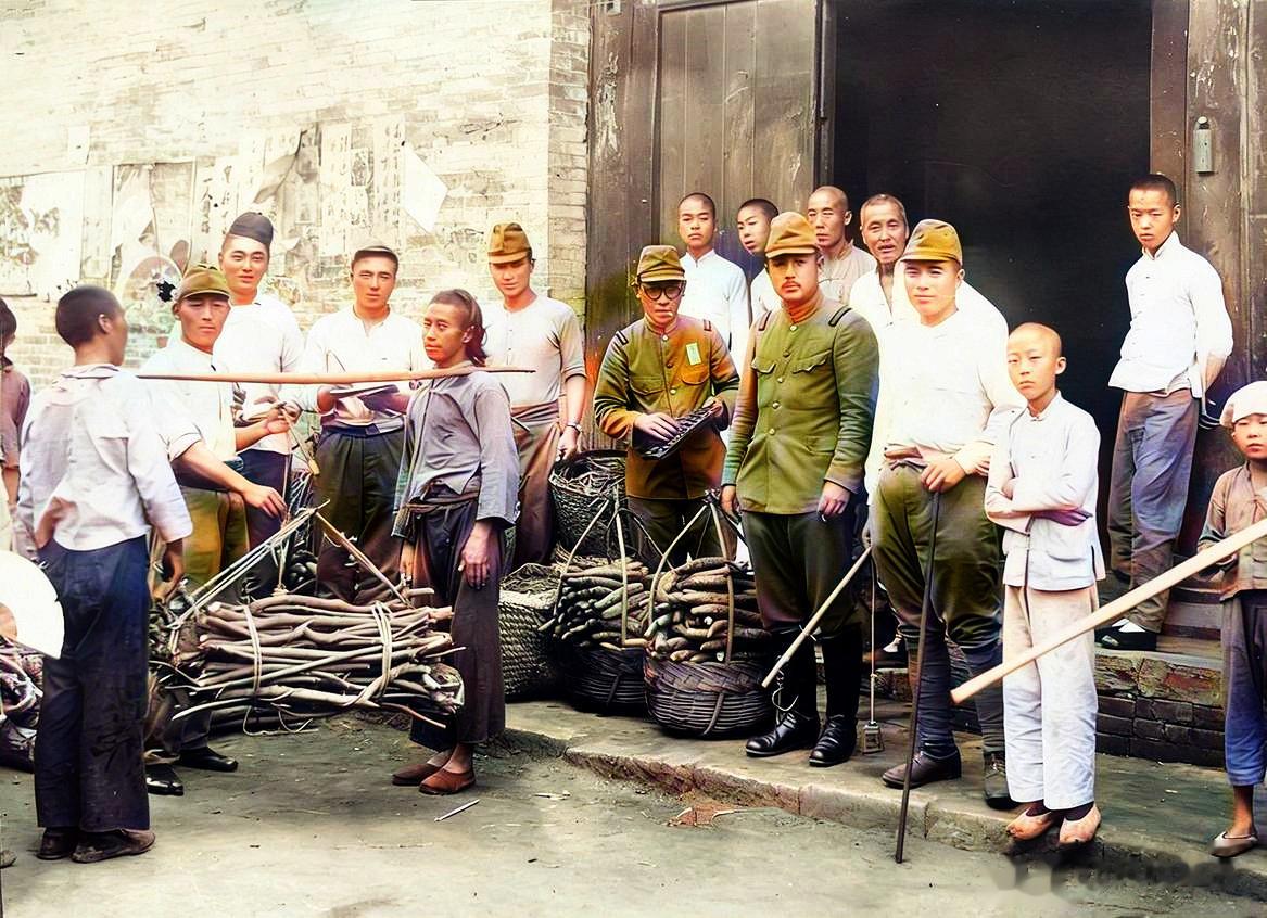 日本驻水治镇本部门前,亲日的汉奸商会正组织百姓给日军供应生活物资,此时正在给木柴称重,旁边的台阶上放着满满两箩筐的黄瓜。