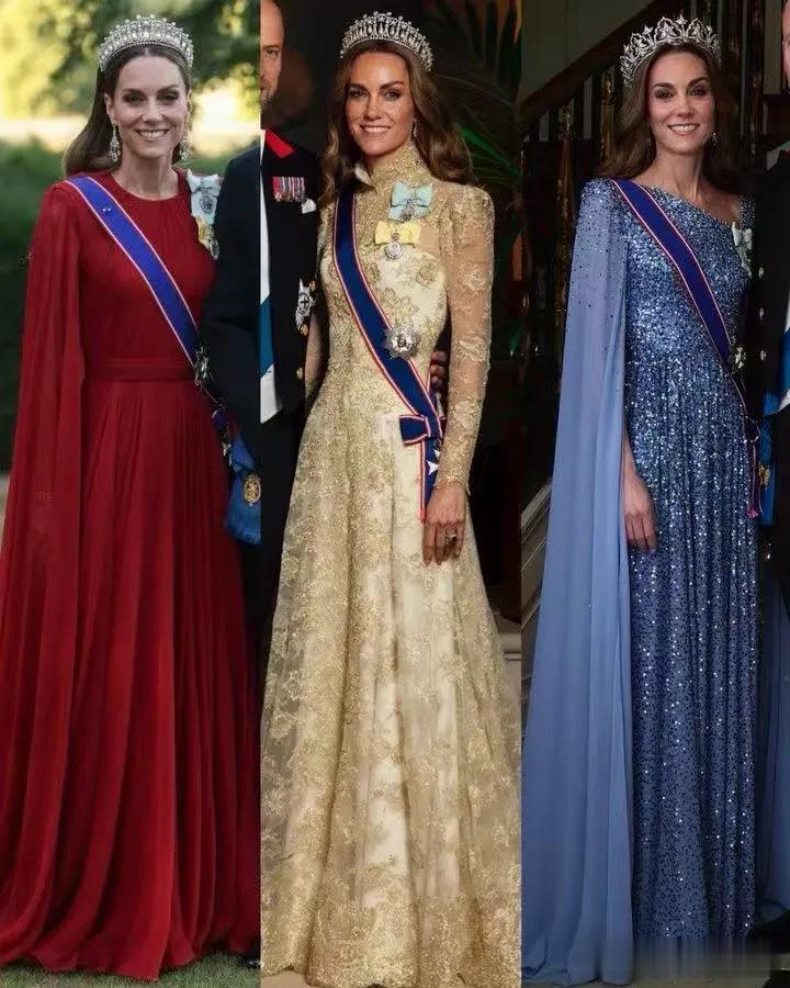 依据传统当晚出席晚宴的王室女眷都会身着晚礼服和佩戴冠冕,在大家的期待中凯特王妃以一身缀满水晶的蓝色斗篷式礼服亮相,这件礼服来自品牌Jenny Packham。