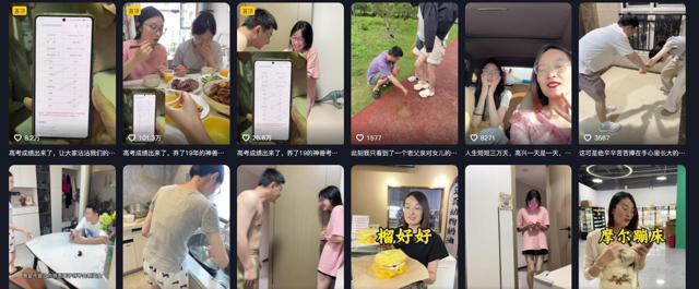 后来真实记录的视频发完了,一家人又开始写剧本,编段子,依旧利用话题博取流量,中间还穿插一些“父爱”“人生苦短”之类的词条。